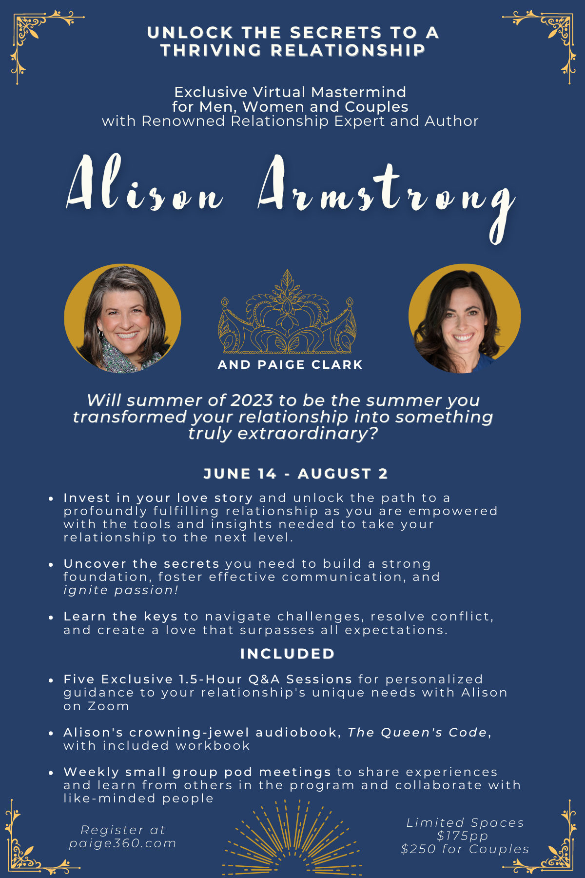 Dive into one of Alison Armstrong's most transformative classes and gain clarity and practical tools to create more joy, intimacy, and partnership in your life with the support of a tribe!
